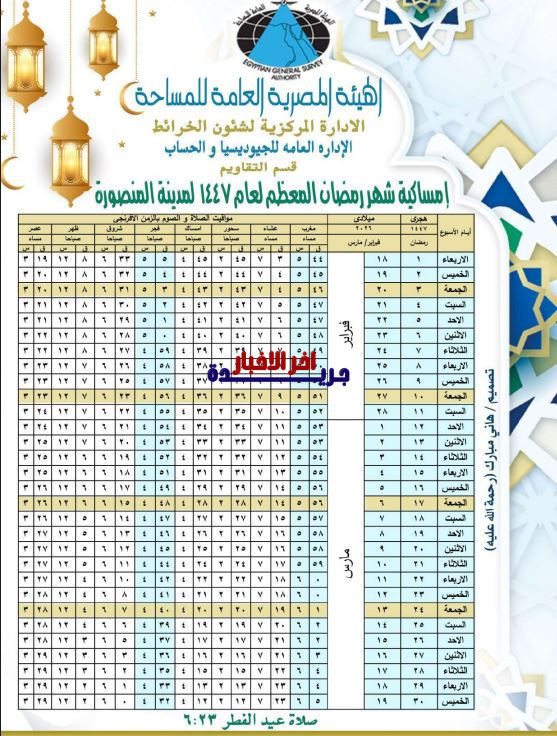 إمساكية رمضان 2026 المنصورة