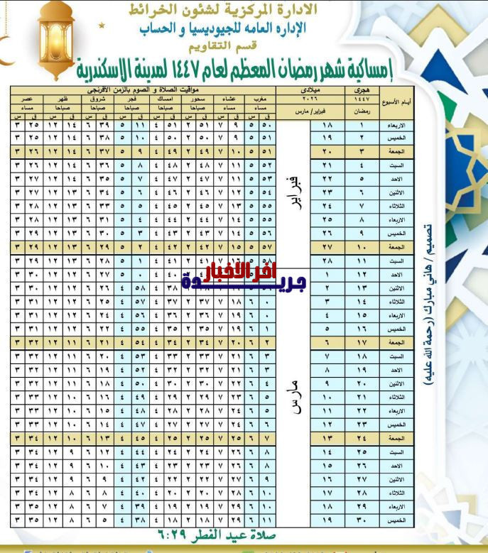- توفر إمساكية رمضان 2026 للإسكندرية جدولاً يوميًا مفصلاً لمواقيت الصلاة، بما في ذلك الفجر والظهر والعصر والمغرب والعشاء، إضافة لمواعيد السحور والإفطار، لتكون مرجعًا دقيقًا يساعد الصائمين على الالتزام بمواقيت الصلاة والصيام بشكل منظم.