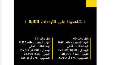 لتلقي محتوى القناة بجودة عالية، يمكن ضبط الترددات التالية: